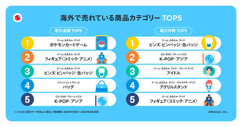 メルカリShopsの市場となるフリマアプリ「メルカリ」では、海外のお客さまからのトレカ需要が非常に高く、実際に海外で売れている商品カテゴリーの中でも、ポケモンカードゲーム関連の商品は取引金額総額で首位となっています。