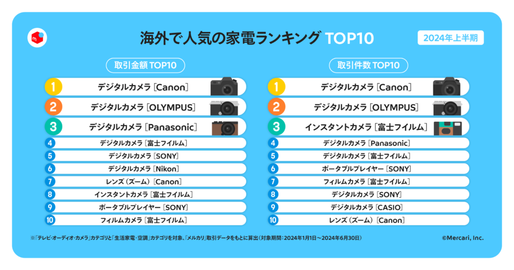 日本製カメラは高い技術力と性能に加え、日本国内で日常的に丁寧に扱われるため、良好な状態で中古市場に出回る傾向があります。さらに、2024年上半期におけるデジタルカメラの日本向け以外の総出荷台数は前年比で108.9%、金額では115.6%と増加※しており、海外での日本製カメラの需要が高まっていることが示されています。これらの要因が重なり、日本の中古カメラは海外で「新品に近い品質を持つ信頼できる商品」として高く評価され、「メルカリ」の越境取引においても人気の高いアイテムとして、取引が活発化していることがわかりました。