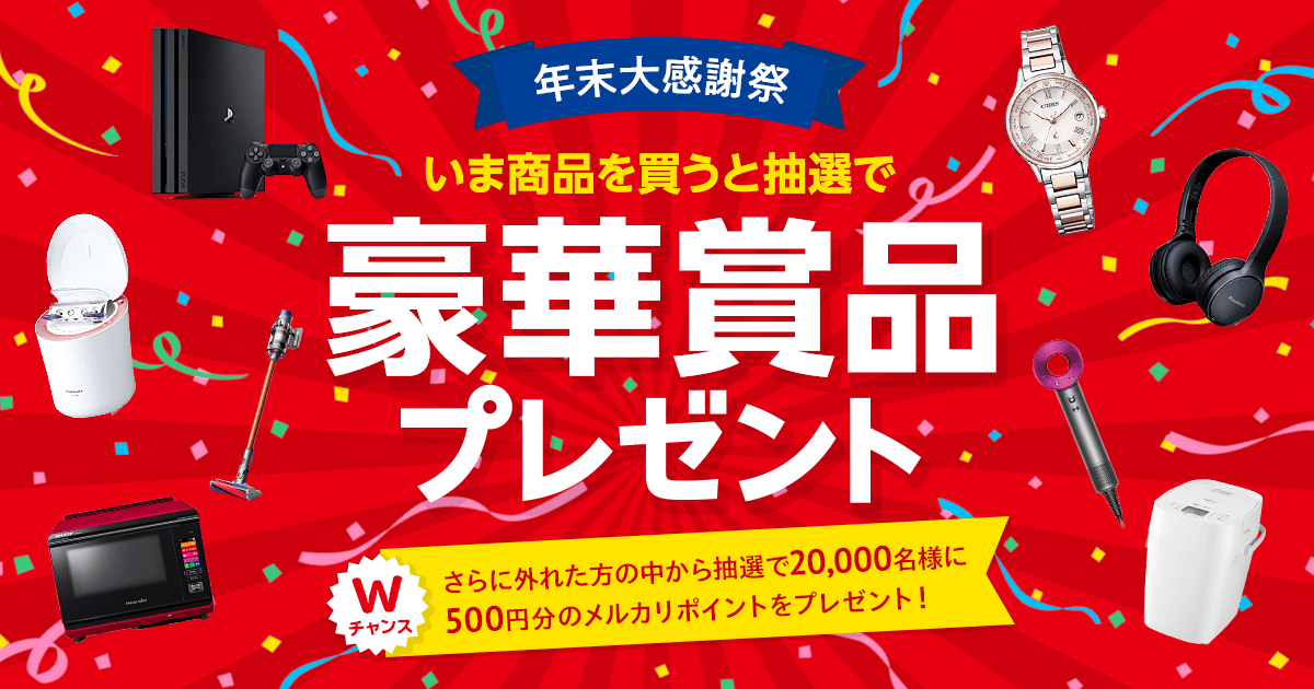 また、応募した賞品の抽選に外れたお客さまの中から、抽選で20,000名の方に、500円分のメルカリポイントをプレゼントいたします。