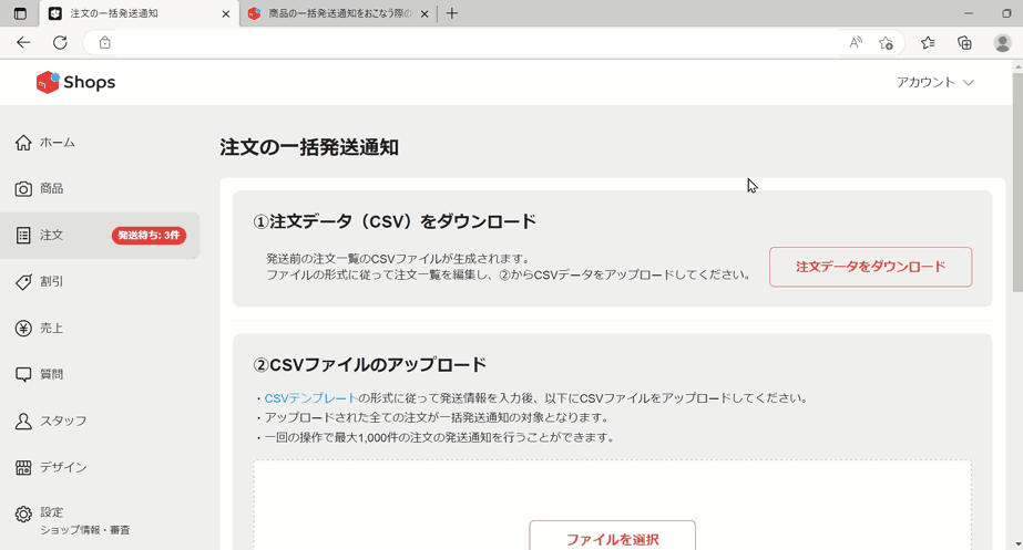 CSVファイルのアップロード、内容確認、発送通知を送るまでの操作はこちらをチェック👇
