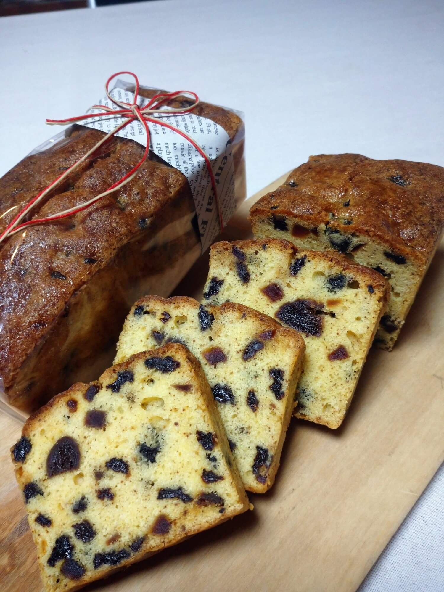 「フルーツパウンドケーキ」です。これはお店をやっていた時から作っていたものだったのですが、レーズン、パパイヤ、いちじくなどのフルーツをラム酒に漬けるところから手作りしています。