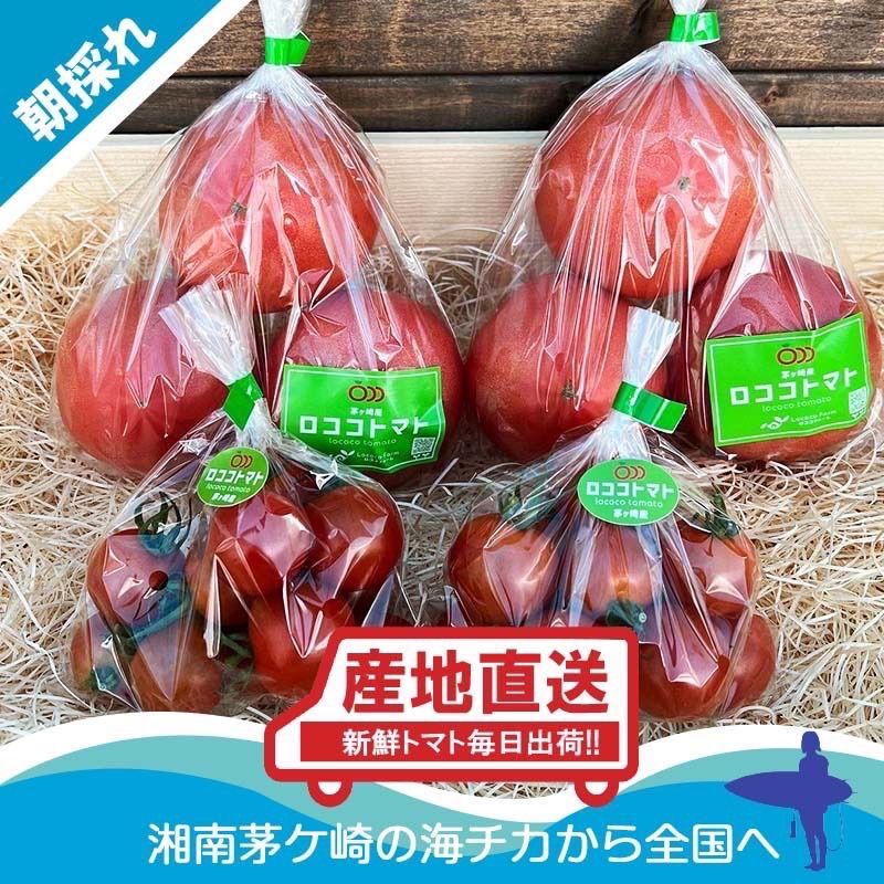 朝採れトマトです。14時までの注文で、朝収穫したものを当日発送しています。特に大玉トマトと中玉トマトの詰め合わせが一押しです。